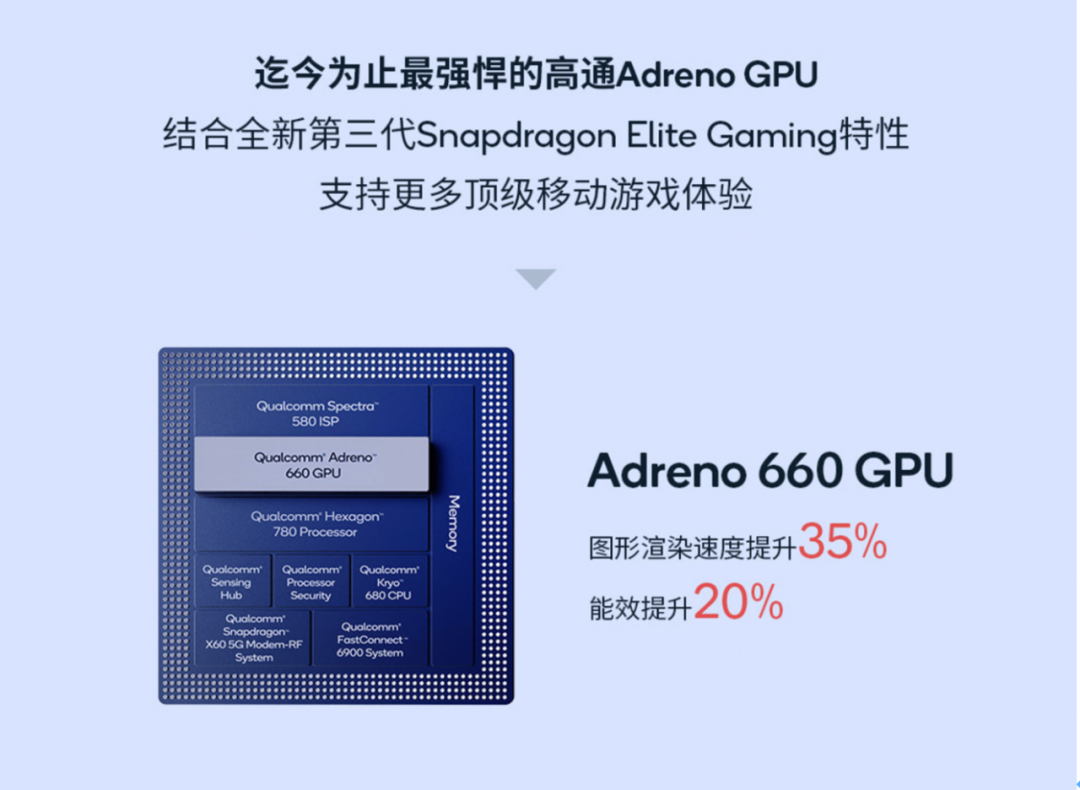 搭配骁龙888的是名为Adreno 660的新一代GPU。它相比上代使用的Adreno 650暴增35%的性能,配合第三代的骁龙Elite Gaming技术,Adreno 660有着骁龙史上最大的游戏性能提升。