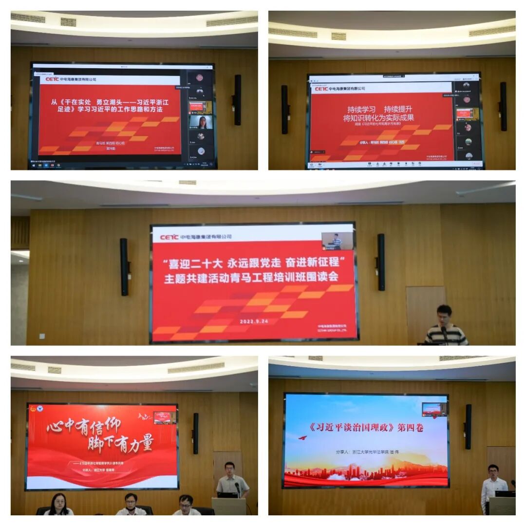 读书是心灵的交流,带来信仰的力量。浙江大学青马学员管秉涛、潘伟与中电海康首期青马班学员沈岙、黄玮勤、张晴分别以“心中有信仰,脚下有力量”“《习近平谈治国理政》第四卷”“持续学习、持续提升,将知识转化为实际成果’”“从《干在实处 勇立潮头——习近平浙江足迹》学习习总书记工作思路和方法”“从《习近平的七年知青岁月》找寻青春答案”为主题进行读书分享,结合书本中的理论知识与自身的生活、学习与工作实际相结合,分享自己对于马克思主义基本原理和中国特色社会主义制度真正内涵的理解。参加围读会的青年学员们针对分享的内容进行互动提问,共同探讨、共同成长。