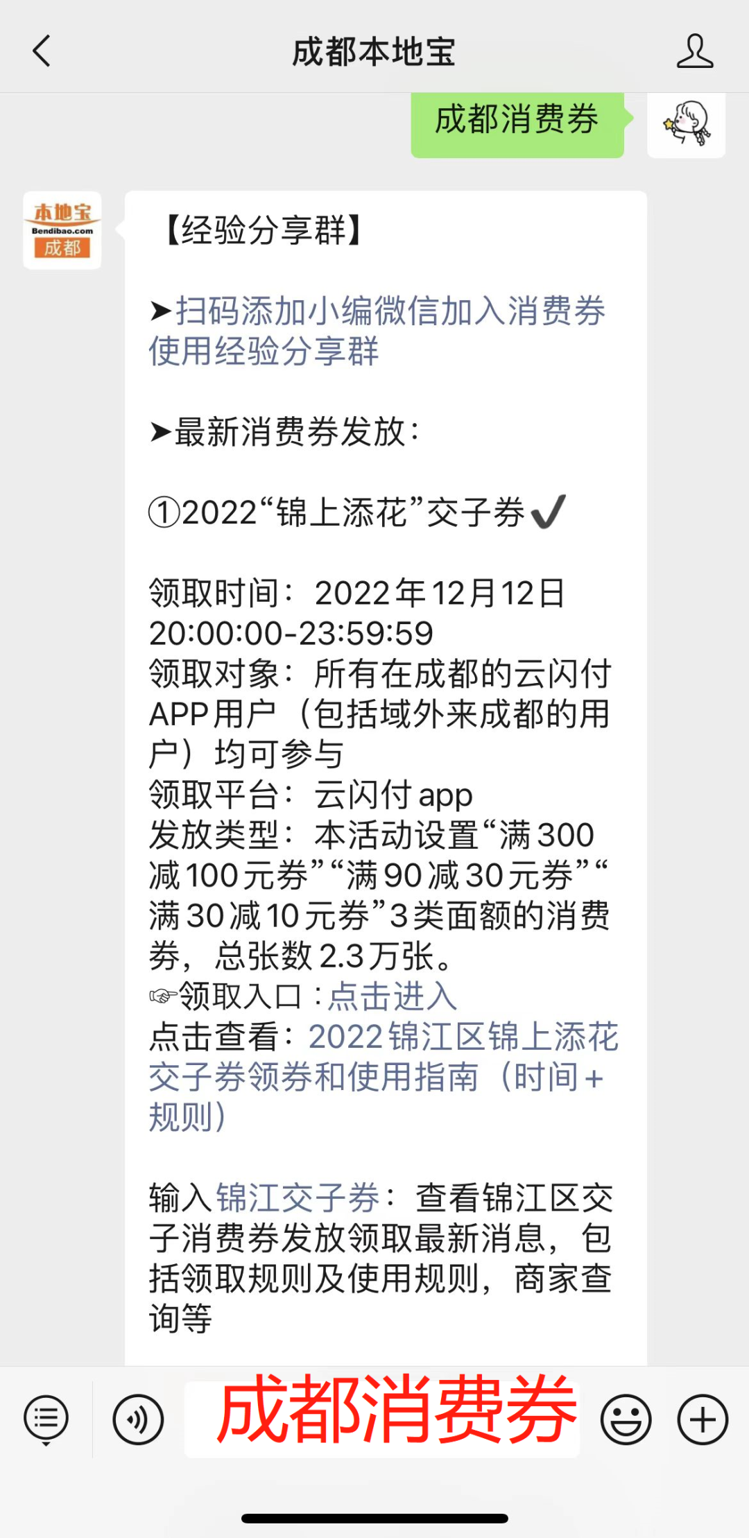 领券方式:云闪付APP,关注【成都本地宝】公众号,在聊天对话框回复【锦江交子券】获取领券入口和可使用商家。