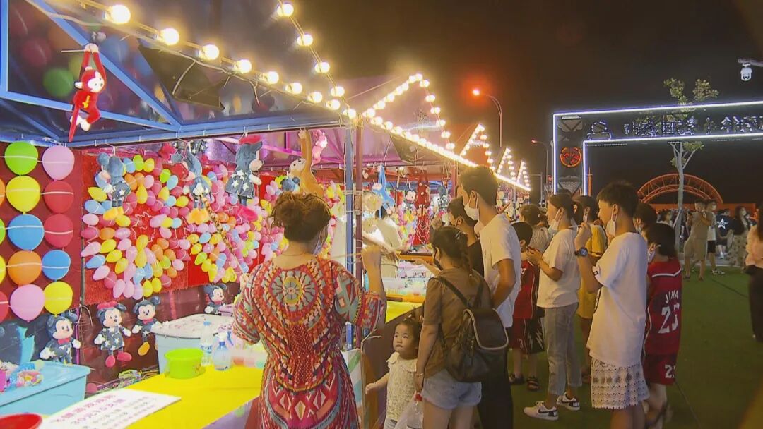 今年“海国夜市”设置两个会场,碧海金沙分会场主营餐饮服务,营业时间只到晚上八点多。而附近的渔人码头主会场,部分摊位营业时间将持续到深夜。此外,这里除了餐饮还有儿童卡丁车、射击等十几个游乐项目和网红打卡点。主会场的摊主大多是持续经营三年的老朋友了,看到今年客人如期归来,他们也十分感动。