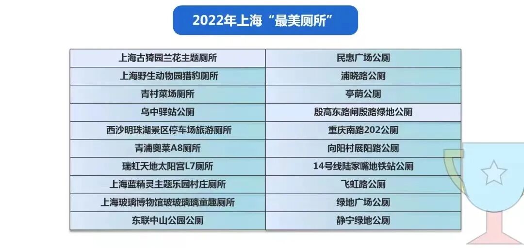 11月14日,由上海市绿化和市容管理局、上海市文化和旅游局、上海市精神文明建设委员会办公室主办的“城市温度,品质服务”2022年寻找上海“最美厕所”推选活动落下帷幕。评审团结合38家候选厕所的网络投票数、实地寻访分值、线下参评汇报表现,分别推选出20家2022年上海“最美厕所”和5家2022年上海“特色厕所”,奉贤青村菜场厕所被评为上海“最美厕所”。详见↓
