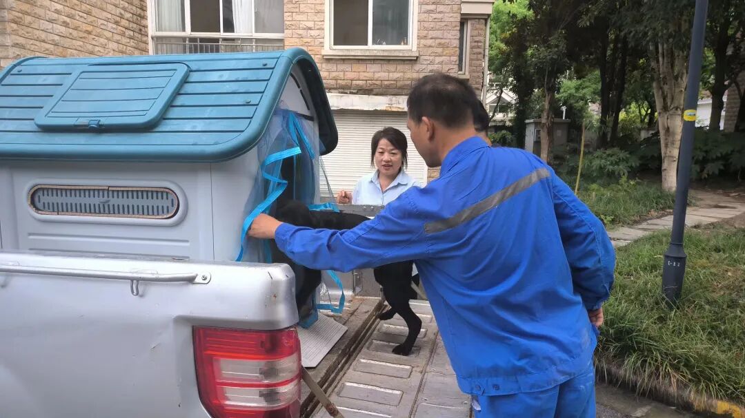 但是由于狗的笼子太大,没法用自己的车子送去,居委联系到了物业借了辆皮卡车,把小狗安全地送到了它的新家。