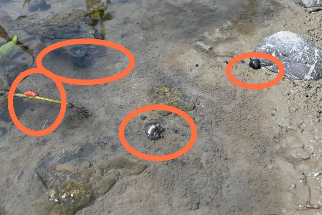 除了小鱼和青蛙等常见生物,一些粉红色的附着在水生植物上的不明生物,引起了大家的好奇。荀子桓的爸爸荀震凯就是其中之一。经过主办方的介绍,大家也了解到,这是入侵物种福寿螺的卵,由于在野外环境下缺少天敌,福寿螺繁衍速度快,一定程度上扰乱了本地的生态系统,也影响了本地的生物多样性。