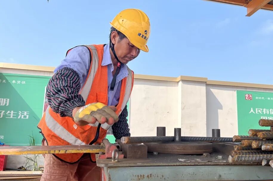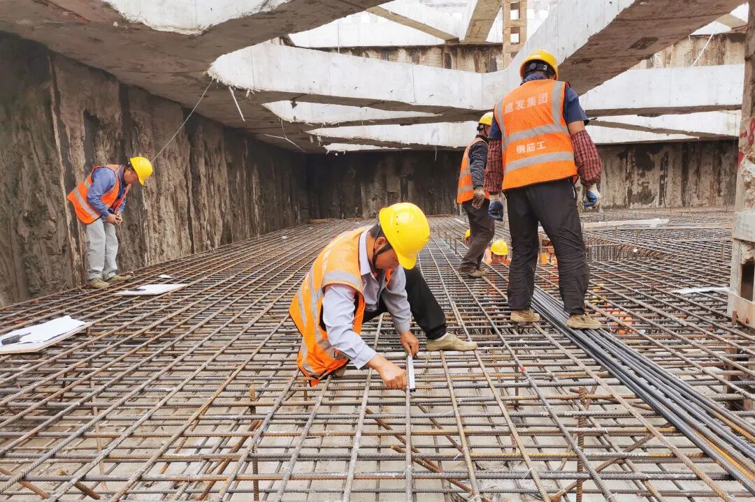 ▲由城投公司开发的奉发·有言项目工地工人们正在测量钢筋间距,绑扎基坑底板钢筋,确保施工质量。