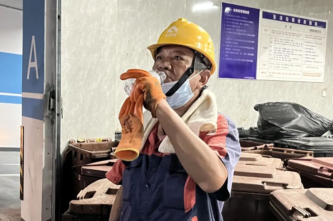 ▲建彧公司垃圾清运工人将收运点位上的垃圾全部清运到作业车上后,喝口水歇口气,准备赶赴下一个点位。
