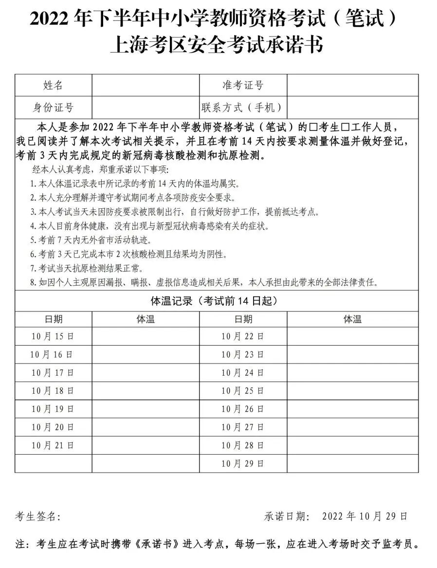 1.10月15日前,考生须在微信小程序或支付宝上完成本人“随申码”和“通信大数据行程卡”的注册,同时下载打印《2022年下半年中小学教师资格考试(笔试)上海考区安全考试承诺书》(附文后,以下简称《安全考试承诺书》),考前14天起按要求做好自主健康管理,如实、完整填写《安全考试承诺书》并签字确认。考生对《安全考试承诺书》的真实性负法律责任。