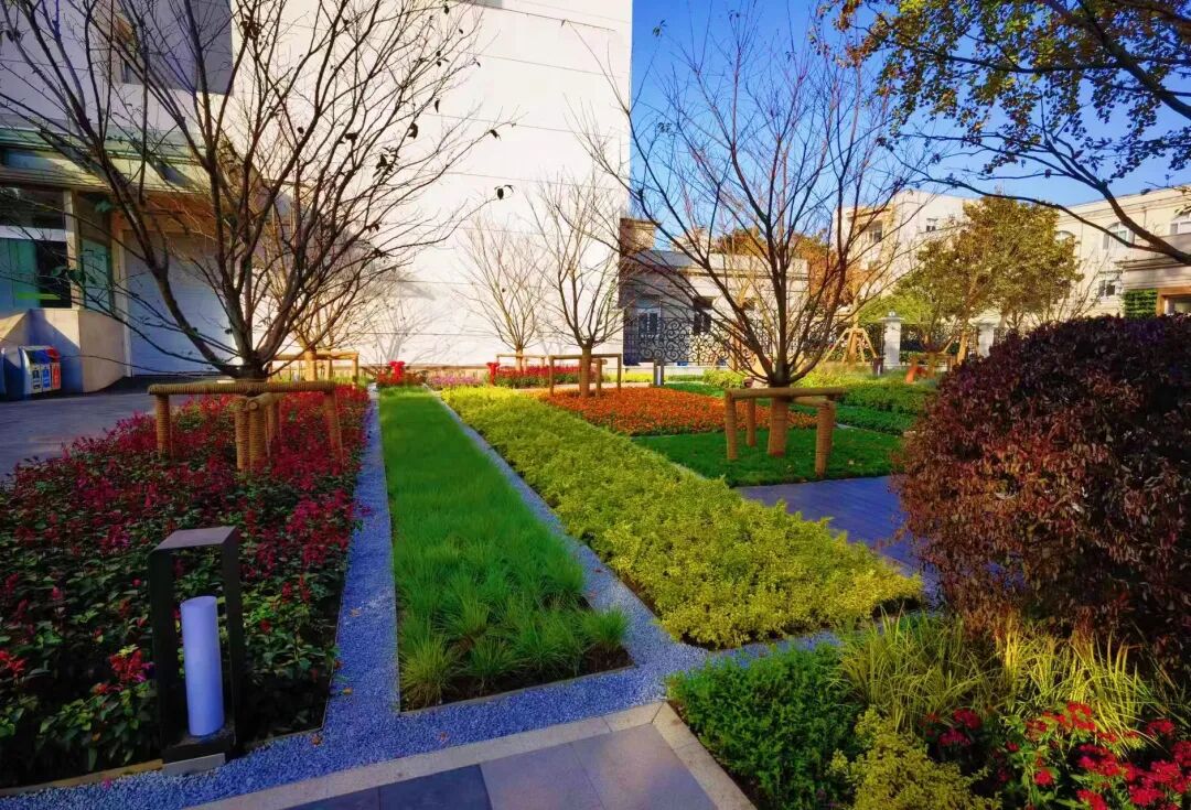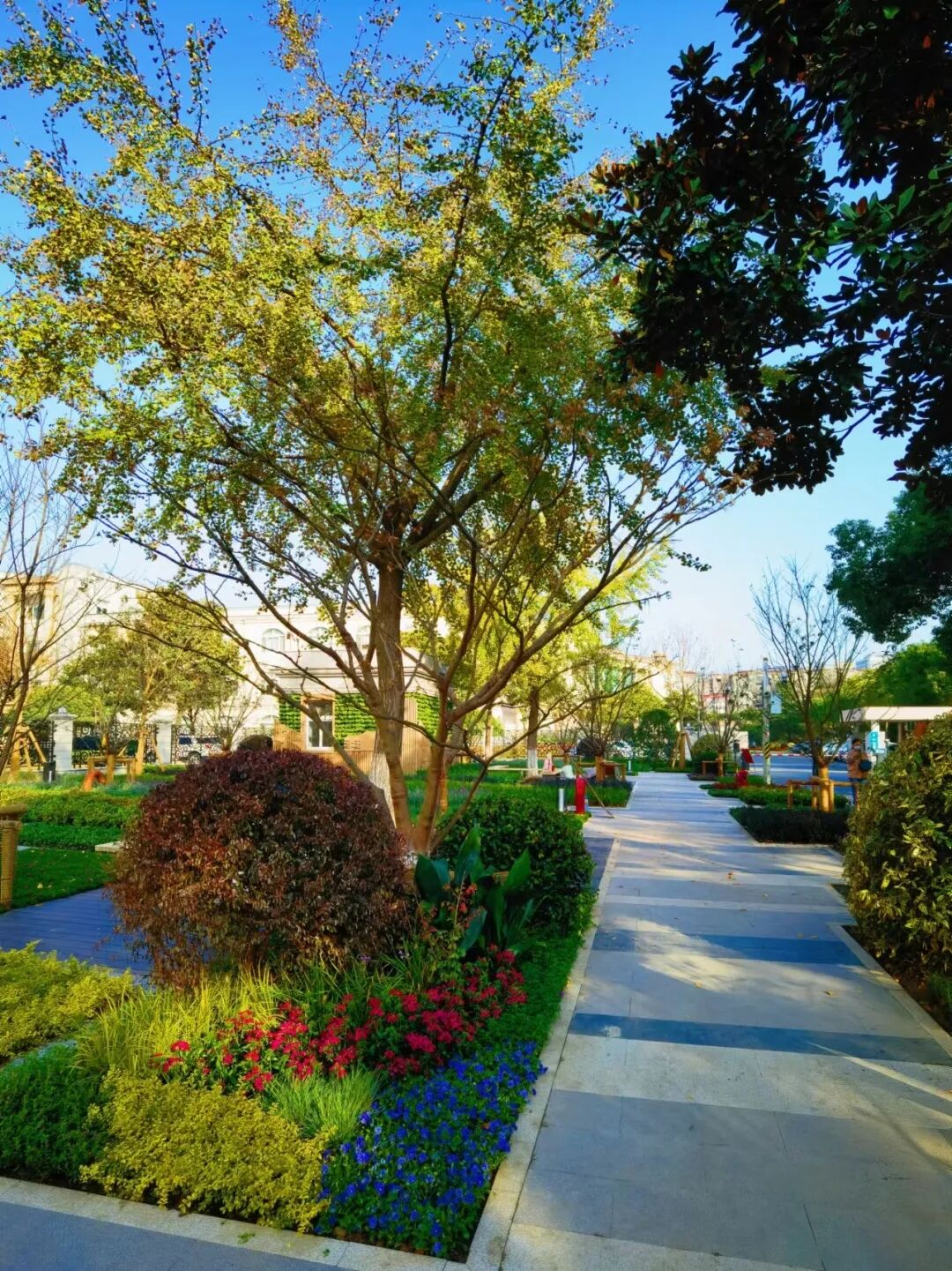 景观上注重春花秋色的季相变化,春花主打染井吉野樱;秋色突出银杏、乌桕、鸡爪槭等黄橙色暖色系主题;春末至秋季以蓝雪花、马樱丹、欧石竹花为最佳观赏,简洁雅致的规则式花境,色彩靓丽,气味芳香。