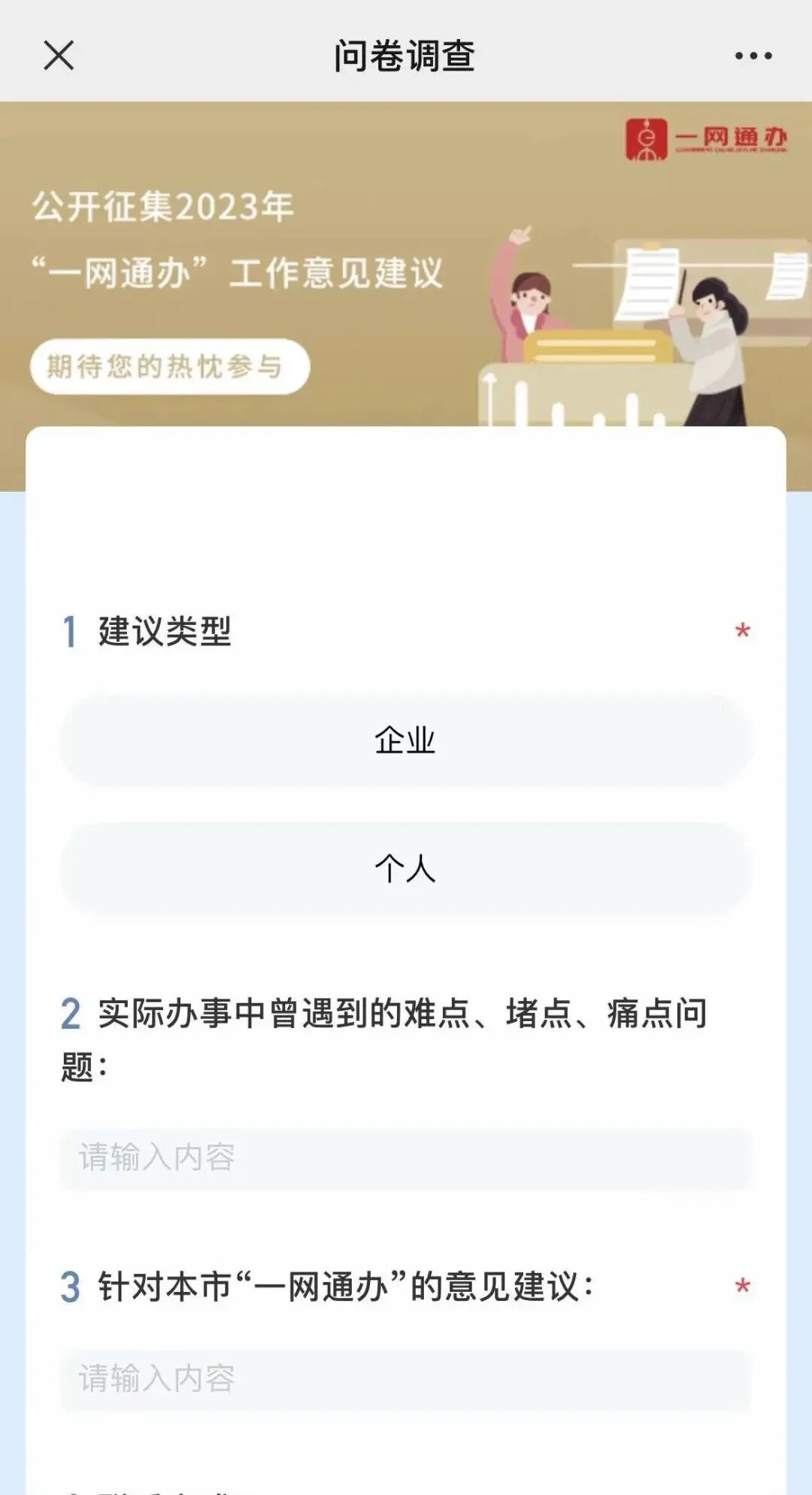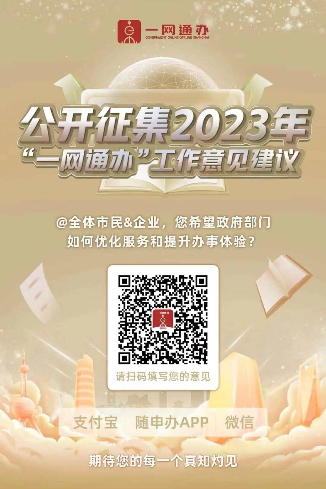 即日起至11月30日,为深入贯彻党的二十大精神和“人民城市人民建,人民城市为人民”的重要理念,进一步推进“一网通办”改革向纵深发展,持续提升企业群众的获得感和满意度,现面向社会公开征集针对2023年“一网通办”工作的意见建议。通过“随申办”微信小程序、“随申办”APP、“随申办”支付宝小程序、“一网通办”PC端,在线参与填写。您的宝贵建议有可能被市政府相关部门采纳落实,快来了解下吧!