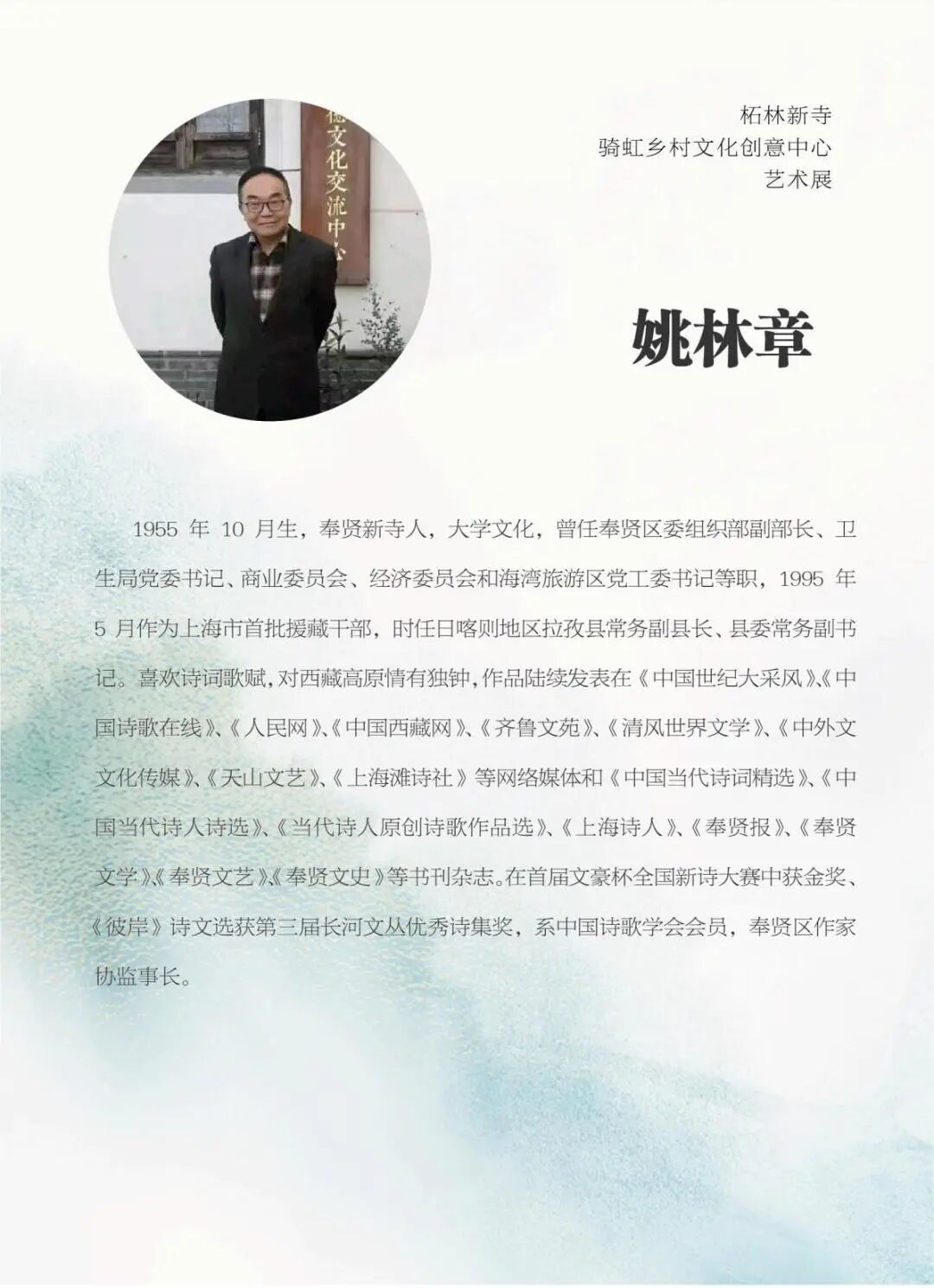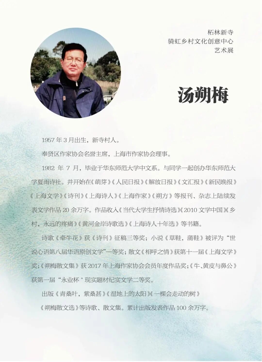作为策展人之一,同样出生于新寺村的汤朔梅也是入驻的作家代表。汤朔梅毕业于华东师范大学中文系,曾与同学一起创办华东师范大学夏雨诗社。作品《朔梅散文集》获2017年上海作家协会会员年度作品奖 、《牛、黄皮与鼻公》获第一届“永业杯"现实题材纪实文学二等奖,累计出版发表作品100余万字。现为区作家协会名誉主席,上海市作家协会理事。