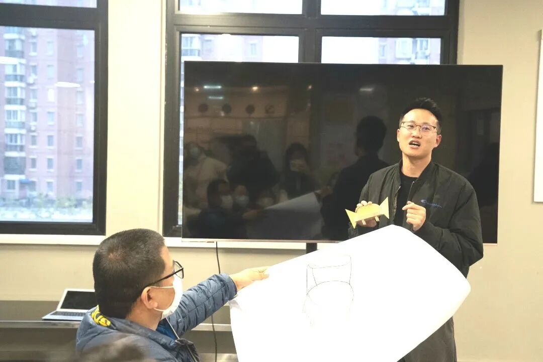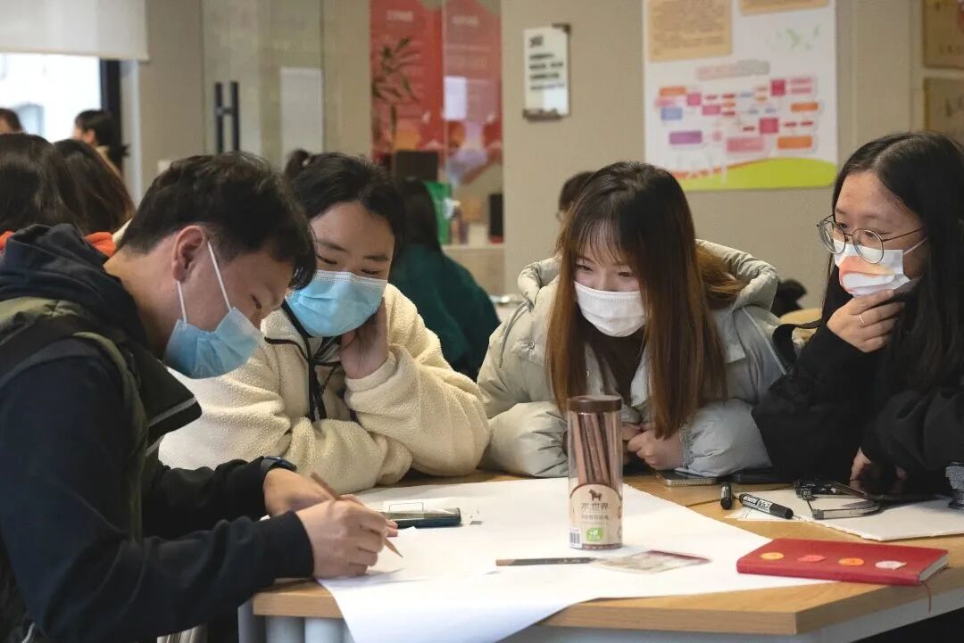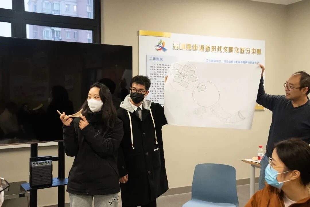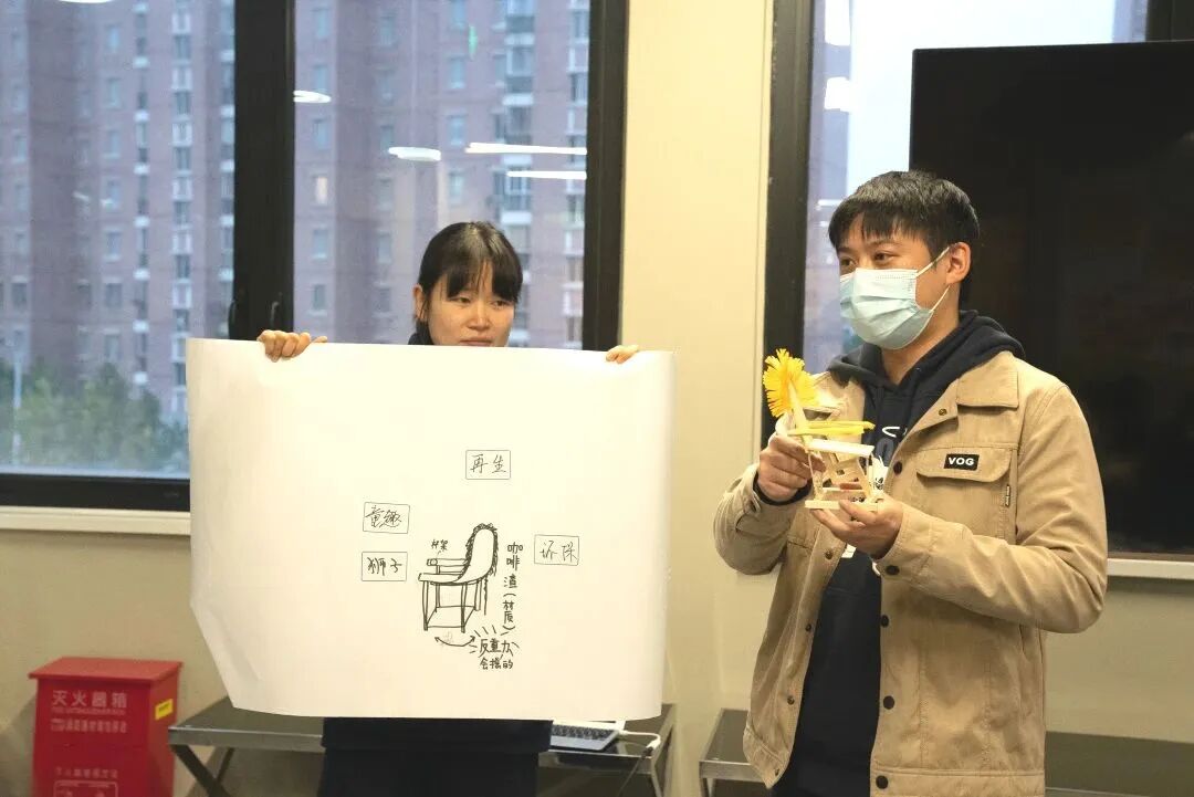 青年和商户化身“青春社计师”,针对韩村路五家不同类型的店铺分组开展头脑风暴,发挥想象、设计讨论,结合店铺和街区双重特点画出属于商户独一无二的椅子,并在现场共同制作模型,以木质模型呈现设计理念。