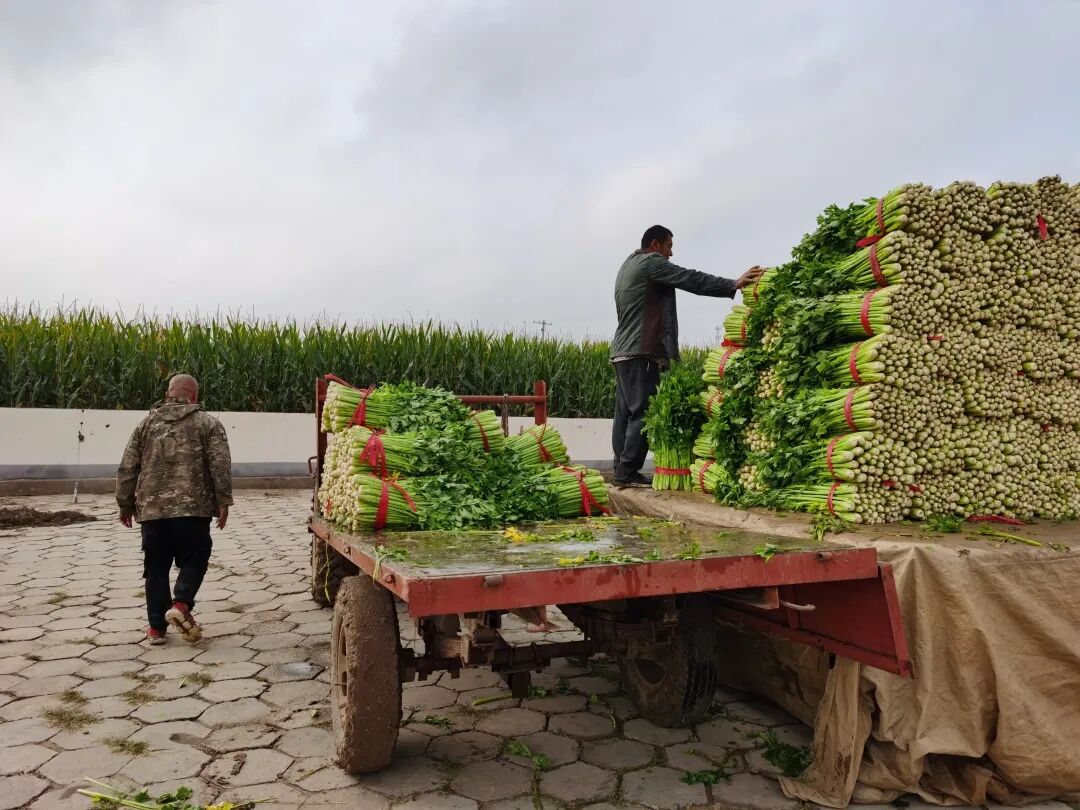 达拉特旗树林召镇林原村里的空场上,新鲜的芹菜正在装运,空气中飘逸着特有的菜香。菜农用拖拉机把成捆的芹菜拉到空场,每斤芹菜售价1元。收菜的人开着大车,以每斤1.4元的价格批发给包头的菜商。还有一位搬运工,因为他在忙,我们没去打扰。