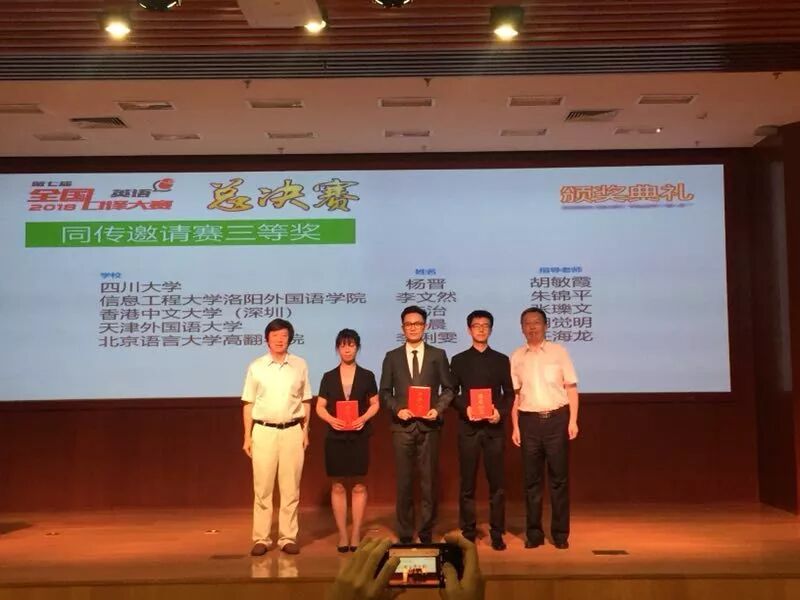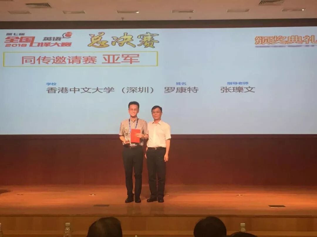 2018年6月24日,第七届全国口译大赛(英语)全国总决赛在北京师范大学落下帷幕。来自香港中文大学(深圳)人文社科学院同声传译专业的三名研究生成绩出色,载誉而归。其中,2016级罗康特同学获得全国同传邀请赛一等奖第二名(亚军)、李治同学获得全国同传邀请赛三等奖;2017级张文康同学获得全国交传总决赛一等奖;翻译高级讲师、翻译硕士课程负责人张瓅文博士获得“优秀指导教师”奖。
