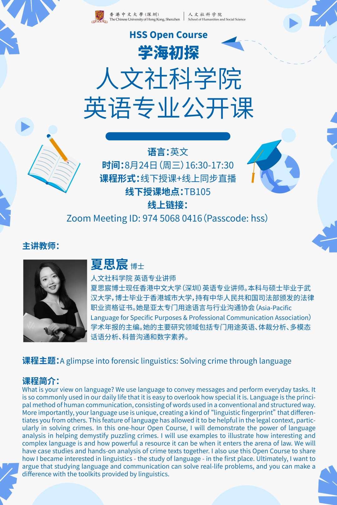 香港中文大学(深圳)人文社科学院创立于2014年,至今已有八年的历史。其间,学院上下求索,精诚而拓,致力于打造多领域、高质量的课程项目。截至目前,学院共开设三个本科专业、六个硕士研究生课程和三个博士研究生课程。本科招生专业开设了翻译、应用心理学、英语三个专业。新学期将至,学院邀请到各个本科专业的优秀教师开设公开课堂,让大家提前体验全英教学的真实课堂,近距离领略各学科的魅力,精彩不容错过!