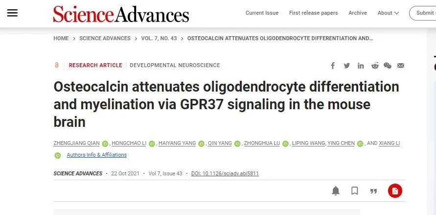 10月22日,中国科学院深圳先进技术研究院脑认知与脑疾病研究所李翔团队的最新研究成果发表于Science Advances上。研究团队历时4年,发现了骨钙素(OCN)对中枢神经系统中的少突胶质细胞的关键调节作用,并首次界定了介导骨钙素这一新中枢功能的全新受体——G蛋白偶联受体(GPR37)。助理研究员钱政江博士为论文第一作者,李翔研究员为论文通讯作者。深圳先进院为论文第一单位。