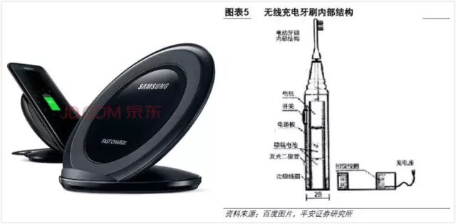△ 左边是三星手机的立式无线充电器,采用的就是电磁感性耦合的充电方式。买手机不送此配件。图片来源:京东商城。右边是我们平时用的电动牙刷内部结构图。