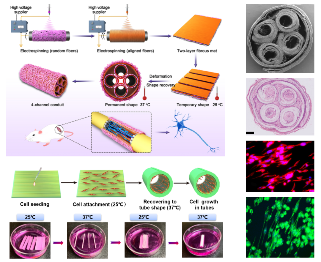 长段神经缺损往往导致靶器官功能受损,致残率较高。仿生天然神经束的多通道神经导管能有效防止轴突分散、减少神经错配,更加有利于神经功能的恢复。研究团队提出将温度响应的形状记忆聚合物引入神经导管的构建,通过静电纺丝技术制备双层纳米纤维膜,利用材料本身的形状记忆特性实现体温下形变响应,快速构建多通道神经导管。