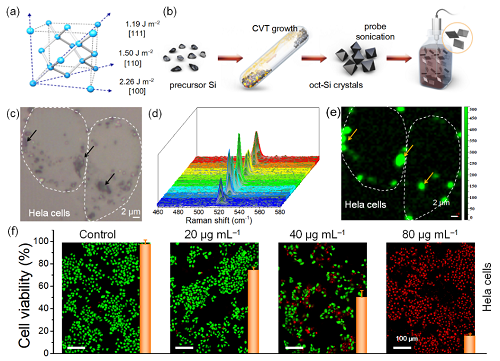 二维硅纳米片的制备及生物光子学应用:(a)硅的晶体结构示意图及各晶面解理能;(b)化学气相传输法制备八面体硅和探头超声制备SiNSs的示意图;(c)Hela细胞的明场图像;(d)细胞内2D SiNSs拉曼散射谱;(e)细胞拉曼成像图(白色虚线描绘了细胞轮廓,箭头指示了SiNSs的细胞内分布);(f)含有不同浓度SiNSs的Hela细胞在1064 nm激光光照5 min后的存活率和荧光照片。