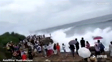 而在另一则视频里,可以看到在同样的地点,许多打着伞的游客,面对汹涌而来的巨浪没有任何防备,吓得四散躲逃。