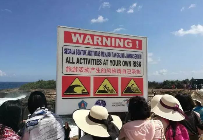 为了防止这样的意外坠崖事件发生,当地的相关部门专门设立了中英文警示牌,警告人们注意悬崖和巨浪的危险。