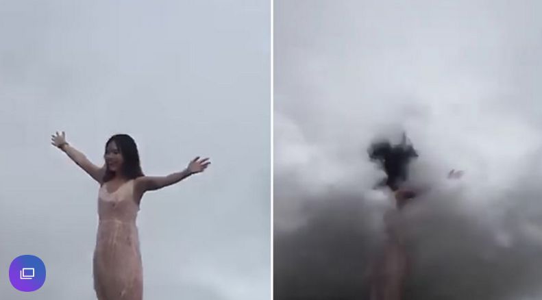 视频中一名女孩站在巴厘岛蓝梦岛一个著名的悬崖边上拍照,但是她却全然没有注意到身后向自己扑来的巨浪。