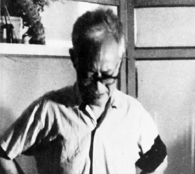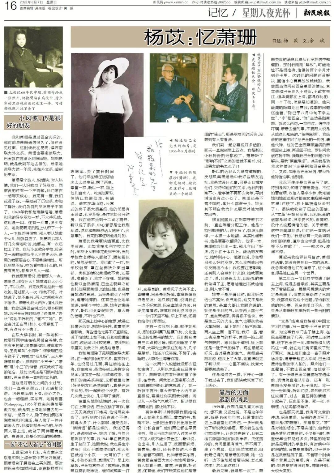 1959年,我因几篇儿童文学被批,想不通,又没处说。不是这年年底,就是1960年年初,我带着赵苡去上海看望他们夫妇,一多半就是为了诉说我的委屈。那次就住在他们家顶楼上,让赵苡先睡了,我到二楼书房里和他们谈到半夜。天还蛮冷的,房间里虽有暖气,早不用了,生了个炭盆。他们当然宽慰我,但我最记得的是萧珊的表情,她一边听一边不住地皱着眉头说,怎么能这样?怎么能这样?!最后见面,就是那一次了。萧珊去世的消息我是从孔罗荪信中知道的。那时我刚刚“解放”,可能地址不是很准确,信辗转两个多月才到他手里。这时他的问题还没解决,回信小心翼翼战战兢兢的。我信里当然问到巴金萧珊的情况,其实他和巴金也久不联系,不敢有来往,但毕竟都在上海,都是作协的,同一个干校,消息是知道的。他只能简略隐晦地回复我,说李的问题还挂着,“陈已于八月中旬不幸去世”。“李”指巴金,“陈”当然是指萧珊。就这么两句,一笔带过。信中还叮嘱,萧珊去世的事,不要跟人说是从他这儿知晓的,“免得麻烦”。我给他的信里还附了给巴金的一封信,请他代转。这时巴金因照顾重病的萧珊回到上海,再没回干校。罗荪问我信还转不转,提醒我巴金的问题仍未解决,要我“慎重考虑”。其实就是劝我这种情况下还是别和巴金联系了。又说,如果给巴金写信,曾经托他转信这事,也别提。 武康路访巴金。那次去上海,就是为了写《坚强的人》。我忍不住还是给巴金写了信,特别是因为知道了萧珊病逝。不过怕惹麻烦,收信人是李小林,我知道她和她爸爸那时都在武康路原来的家里(住楼下,楼上早被造反派封了)。很快就收到了巴金的回信。从“文革”开始到结束,我和巴金的信都是问询、报平安式的,很简短,没什么流露情绪的话。关于萧珊,信中只简单地说,他们俩一直惦记我们一家的,“我想总有一天会得到你们的消息,蕴珍也这样想,但是她等不及病故了”。——就这些,波澜不惊。算起来我给罗荪写信时,萧珊还活着,她没有等到我一家的消息,我总算知道他们的消息了,这个消息却是她已在另一个世界。第二年五一节我向学校请了假去上海,说是去看亲戚,其实主要是为了看望巴金。最想问最想谈的肯定是萧珊了,但在武康路住了三四天,我都没敢说这个话题,深怕触发他的伤心事。巴金也闭口不谈。我只是从李瑞珏那里听到一些当时的情形。“文革”结束后我接受《中国文学》的约稿,写一篇关于巴金的文章。为这事我专门去了趟上海,在巴金那里住了几天。那时楼上还封着,楼下巴金住一间,李瑞珏和九姑妈住一间,就在她们房间里放了张行军床。晚上她们拿出一沓子照片给我看,是萧珊躺在太平间,巴金和遗体告别时家人拍的。照片她们一直藏着,不敢让巴金看,怕他受不了。有一张是巴金叉着腰站在遗体前,表情简直难以形容。还有一张萧珊头发是湿的,肚子隆起。我一张一张地看,听她们说,忽然就忍不住流泪了,过去一直压抑的情绪一下起来了,压也压不住。那一夜,李瑞珏、九姑妈都没睡好。 1972年8月巴金在龙华殡仪馆向萧珊告别。李瑞珏、九姑妈拿给我看的照片中,就有这一张。也是那天夜里,我有写文章的冲动,纪念萧珊。后来的确也写了,题目是《梦萧珊》。那是散文,“梦”是对她的想念,不是实指的,但我的确是梦见过萧珊的,不仅是当时,甚至近年也梦见过多次,梦里的她有时是昆明时的学生样,有时候中年时候的她,背景是模糊的,似乎更多是在武康路院子里。不管哪个时候哪个背景上的萧珊,有一点是不变的:她总是穿得很时髦,神情开朗,大说大笑的。(除特别注明外,照片均由余斌提供)整理:余斌