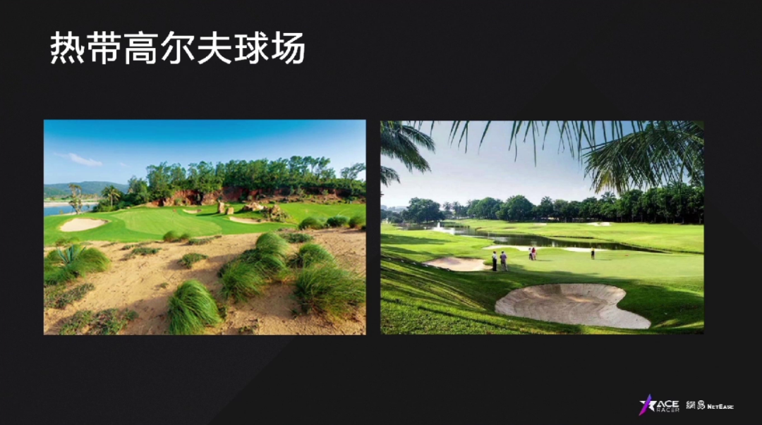于是我们把这段赛道设计到了热带高尔夫球场上。对比一下游戏里面的效果,现在看起来是不是就更大自然呢。