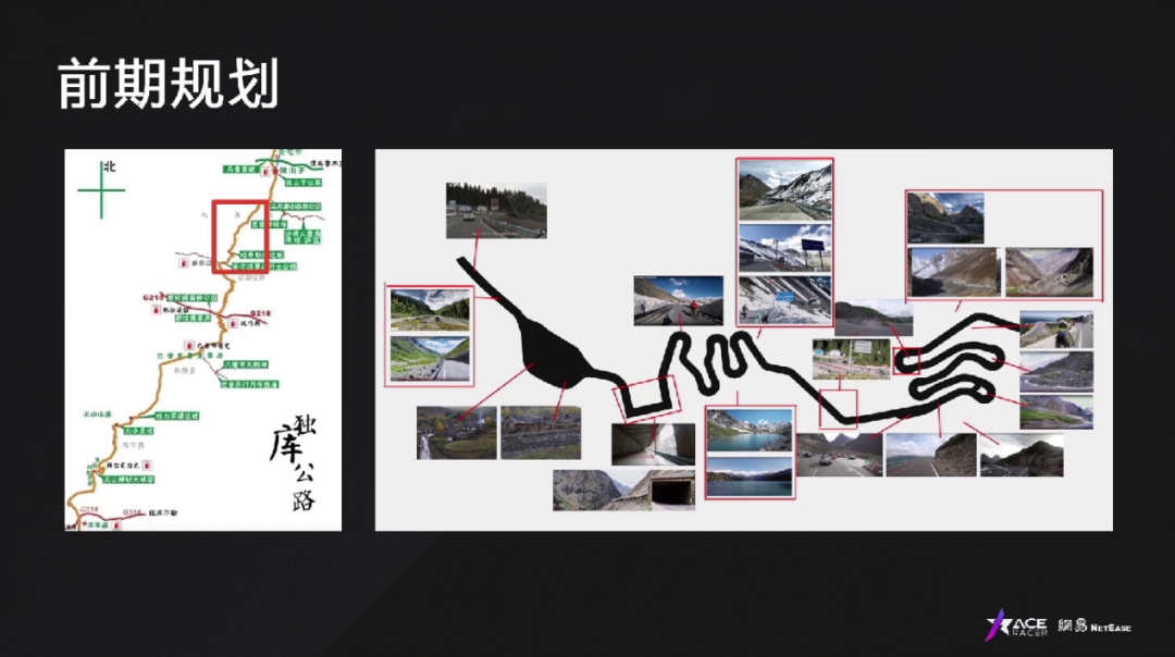 在确定方向之后,从赛道开始我们进行了一定程度的转型。早期的方向是更偏写实。我们可以从下图看到,弯道的设计更偏向自然地貌,比较缓和、不规律,地图相对来说更大。