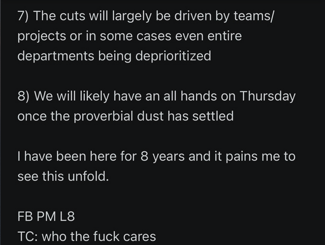具体的裁员过程,目前也被一个号称是 L8(Director、总监级别)的人在网上匿名爆了出来,消息也被转到了一亩三分地职场达人版: