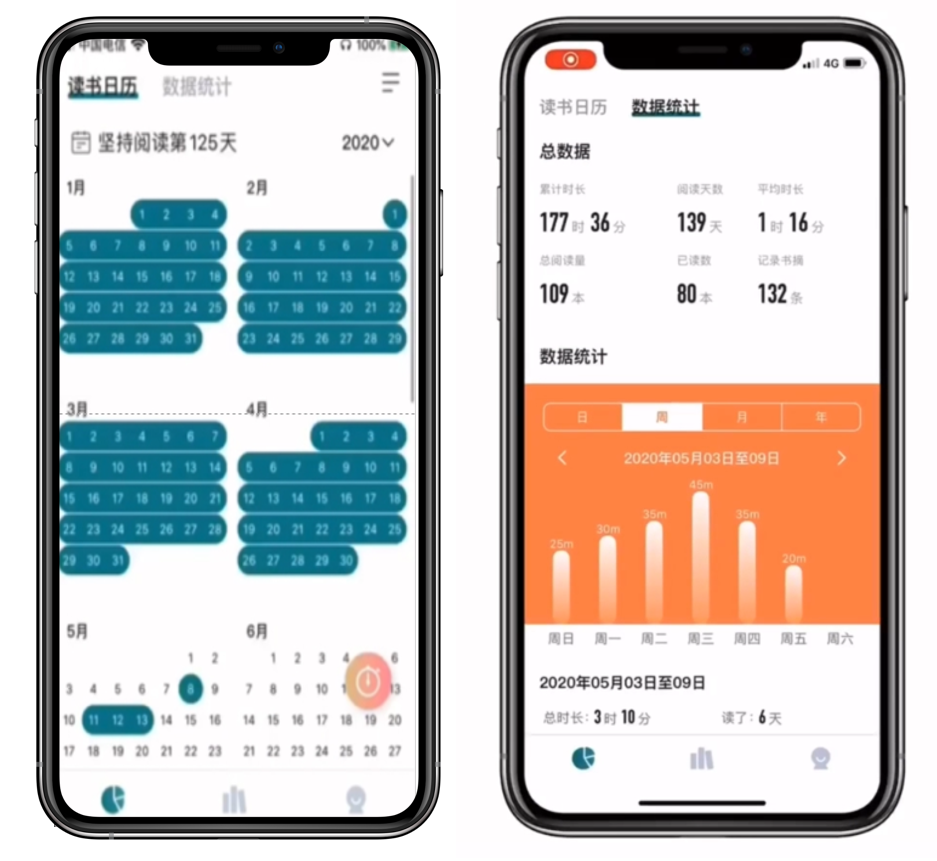 我们还可以查看总的阅读时间、天数,每一本书的时间等整体的数据,看到自己一点一滴的成长,一定会很有成就感吧~