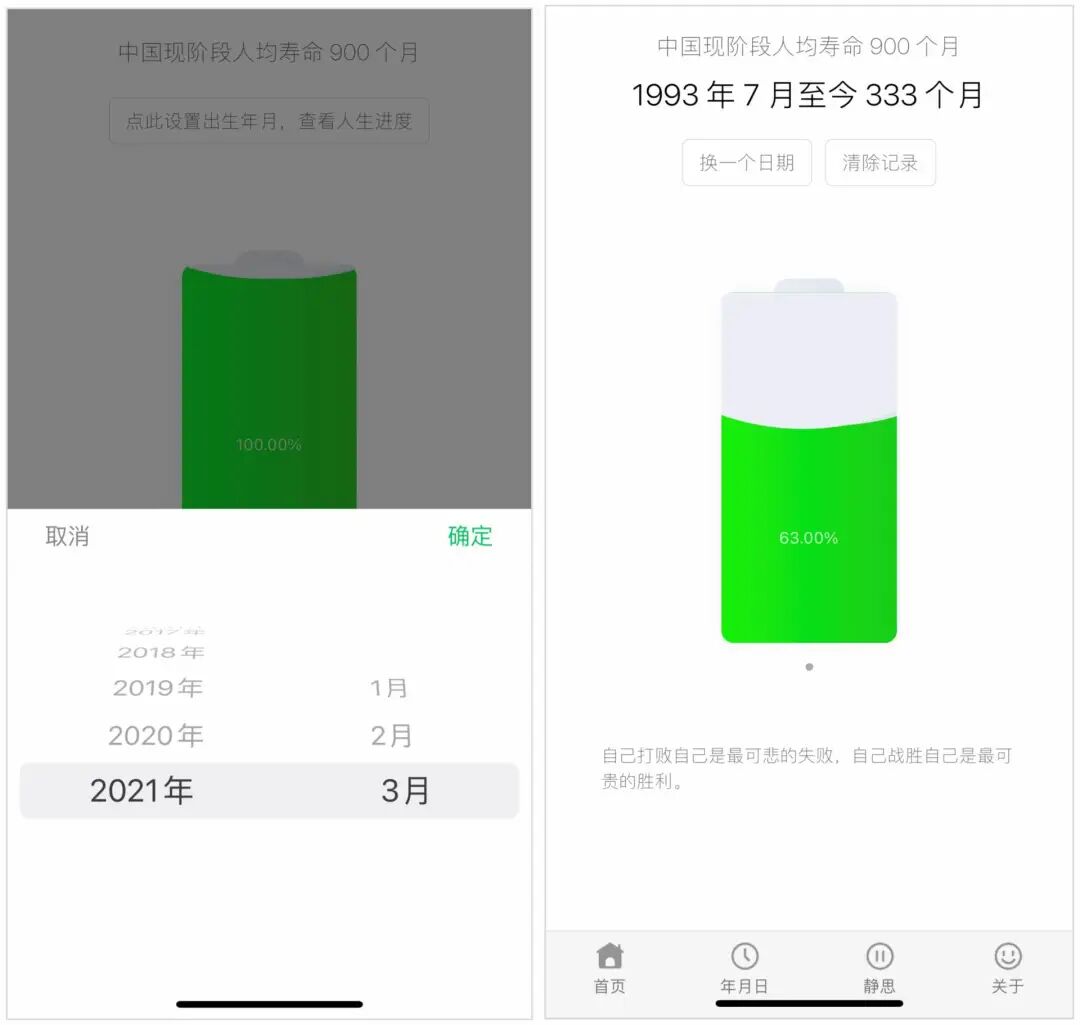 「人生进度」中设置的人均寿命是 75 岁(900 个月),用电池电量显示生命的进度。电池下方还有每日语录,点击即可更换~