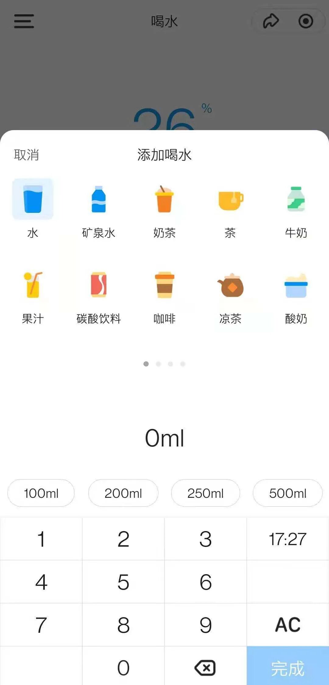 点击屏幕中的【水杯】,就可以记录自己喝水的类型和饮水量。
