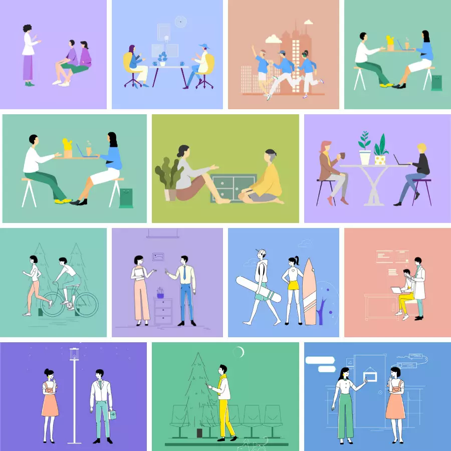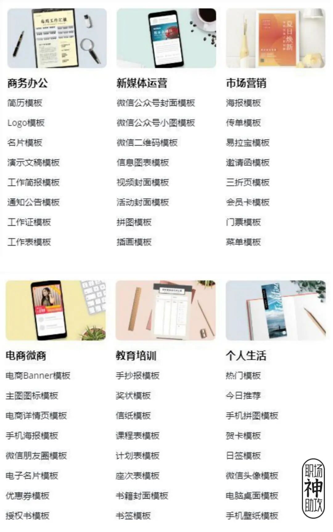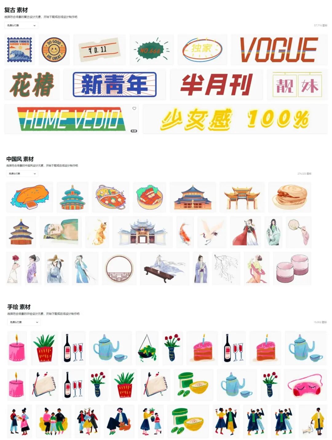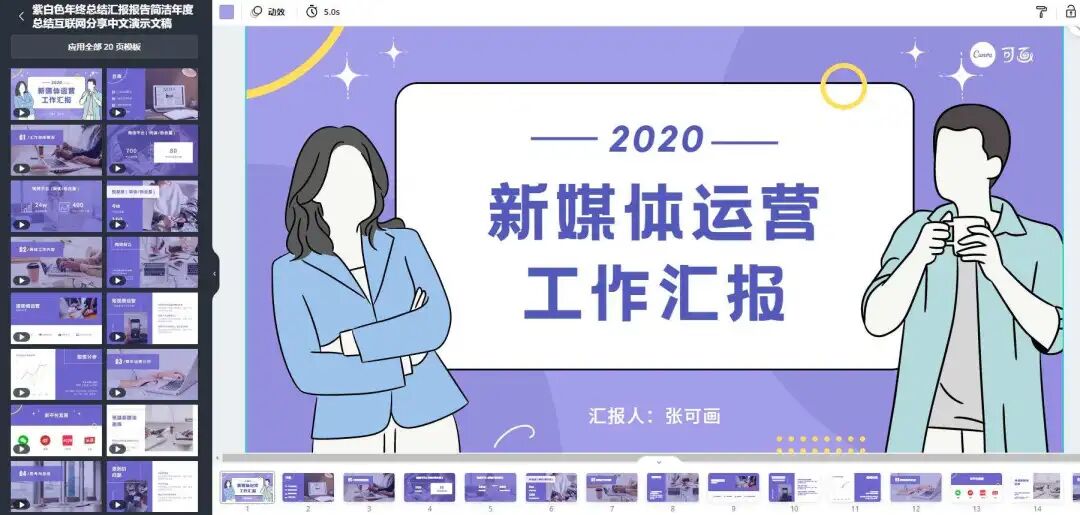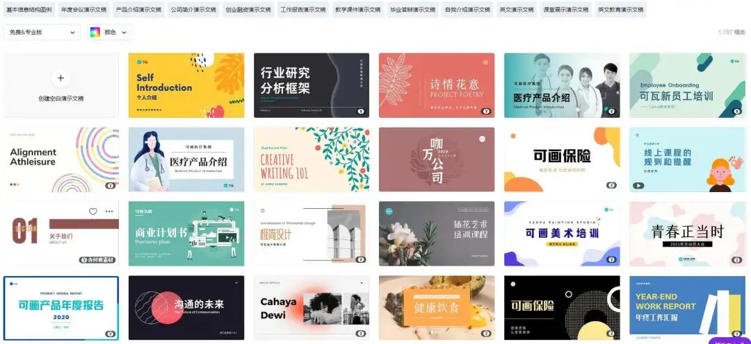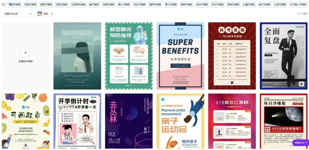 平常花一小时做的海报,听说……在 Canva 里几分钟就能搞定?Canva 里的模板超级多,套上就能用,分类也很清晰。有海报、logo、名片模板,还有 PPT、简历、微信公众号封面模板,同时也按照行业为我们划分了类别。比如 PPT 模板,无论是做年度会议、工作报告、产品介绍,还是做毕业答辩、教学课件,都能在这里寻找到符合场景的模板~再来说说海报模板,按照各种节日来划分,比如情人节海报、元旦新年海报等,质量都很高。无论你是做电商、做新媒体、还是做公益宣传,都能在这里找到合适的模板。如果你对海报模板有颜色要求,直接在左上方戳你想要的颜色就好啦~而且,如果大家有商业用途,最好付费购买 Canva 商用版,避免版权纠纷。打开 Canva 的素材中心,可以看到各个行业各种风格的插画。比如超有氛围感的复古风、特色中国风、可可爱爱的手绘风:这一组扁平风人物插画 —— 可爱娃,表面上看着平平无奇,实际却大有内涵~插画的头部、上身、腿部,全部可以拆分自由组合,就像这样:而且,它还有同系列的环境组件插画,可以拼出你想要的各种场景:Canva 的这些在线作图功能,即使你是设计小白,用起来也不费力,一起看下去吧~拼图工具——网格相框,它做出来的成品看似用时两小时,实际用时两分钟!操作起来超简单,直接将图片拖拽上去,一张看起来精心排版过的图片就做好了~当然啦,除了圆形相框,还有方形、数字等各种形状的相框可以选择。手机壁纸、头像、公众号封面……都可以用这个在线拼图功能来完成。字体如何设计?文字如何排版?这些是大家在作图过程中最常遇到的难题。但是,在 Canva 里,你可以看到数不清的字体样式:还有专业设计师帮你组合好的文字模板,风格多变,颜色多样,看上了就可以直接把它拖拽到你的海报、名片、宣传单上。我觉得这个设计图的背景好好看,可是那个设计图的插画也好喜欢,怎么办呢?实现方式也很简单,只要选中你喜欢的任意元素,复制粘贴就完事~我们打工人的目标是啥?当然是把工作做得漂亮,早日升职加薪。