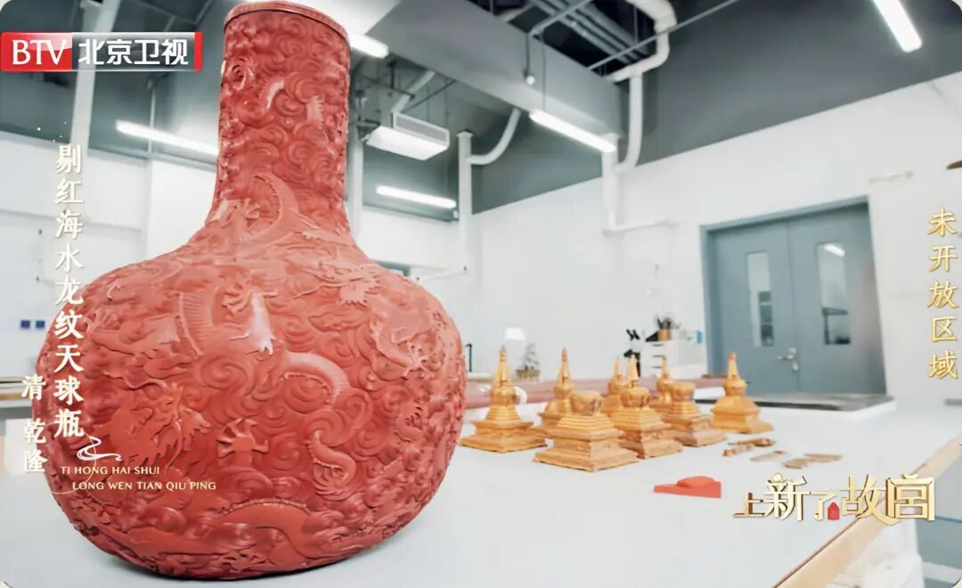 除却早已湮灭的历史和一代代的守护故事,《上新了·故宫》介绍了大量精妙绝伦的制作工艺。点翠、画珐琅、百宝嵌、錾刻,剔红……每一项工艺都极其考验耐心,有时也需要一定的运气。也正因为如此,文物才更显弥足珍贵。这件天球瓶采用剔红的工艺制作而成。剔红即在器物上髹涂一定的朱红漆,然后在漆上做雕刻。通常刷十遍漆会有将近一毫米的厚度,而刷一遍就需要一两天的时间等待干燥。这件天球瓶髹涂了一百遍左右,耗时久,工艺也十分精湛。令人更加称奇的是这件漆纱,它的厚度只相当于一张 A4 纸的厚度,却由 6 层技艺组成!漆纱制作不仅需要匠人手艺精巧,还需要他们配合得天衣无缝。遗憾的是,制作漆纱的工艺已经失传,即使是在科技发达的今天,也没有办法再复刻一件。