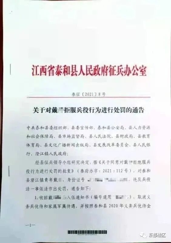 泰和县依据相关法规,根据《关于同意对戴某拒服兵役行为进行处罚的批复》,对他做出如下处罚: