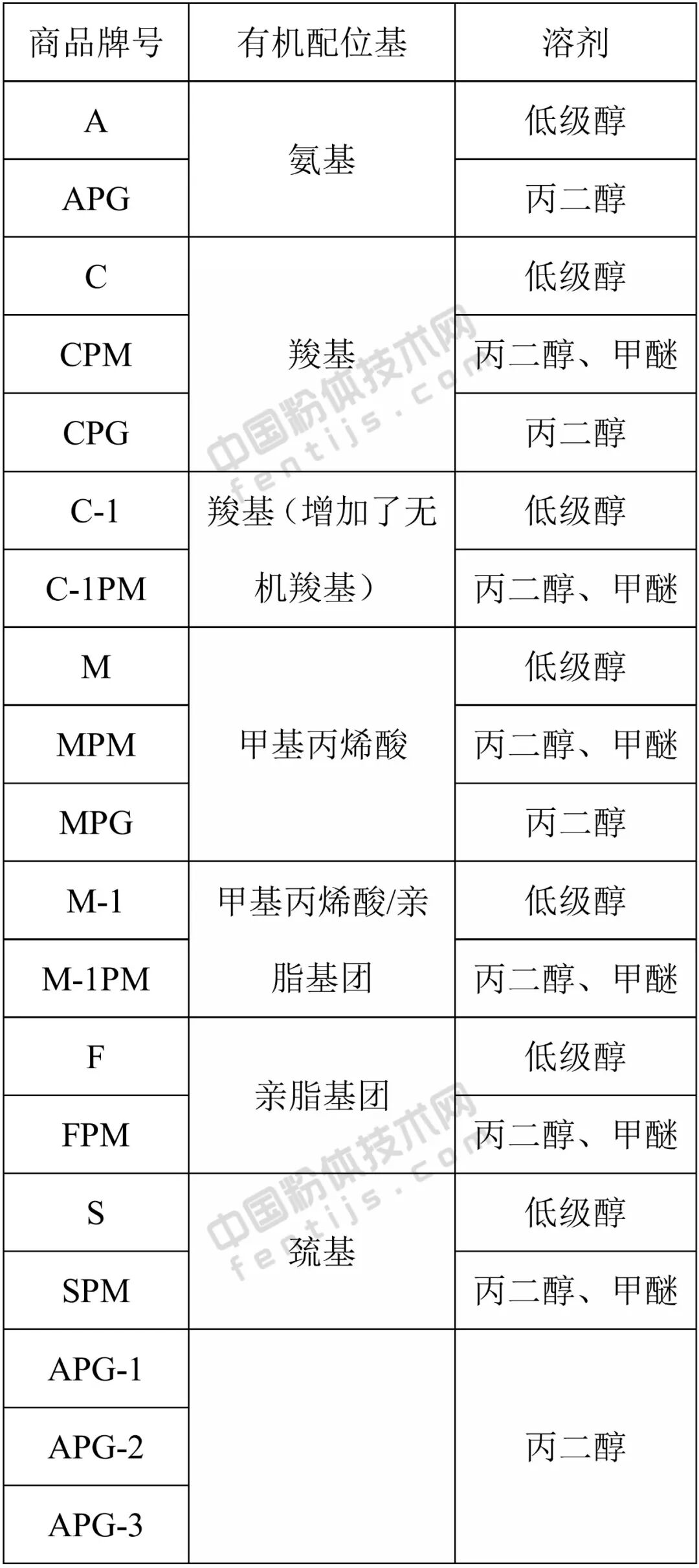 钛酸酯偶联剂的通式为(RO)M-Ti-(OX-R’-Y)N,式中1≤M≤4,M+N≤6;R-短碳链烷烃基;R’-长碳链烷烃基;X-C、N、P、S等元素;Y-羟基、氨基、双键等。按其化学结构可分为3种类型:即单烷氧基型、鳌合型和配位型。