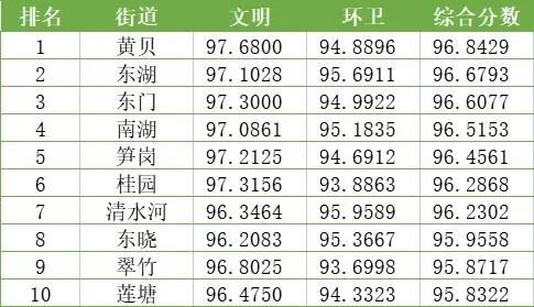 在本次测评中,排名前三的街道依次是:黄贝街道,得分96.8429;东湖街道,得分96.6793;东门街道,得分96.6077。