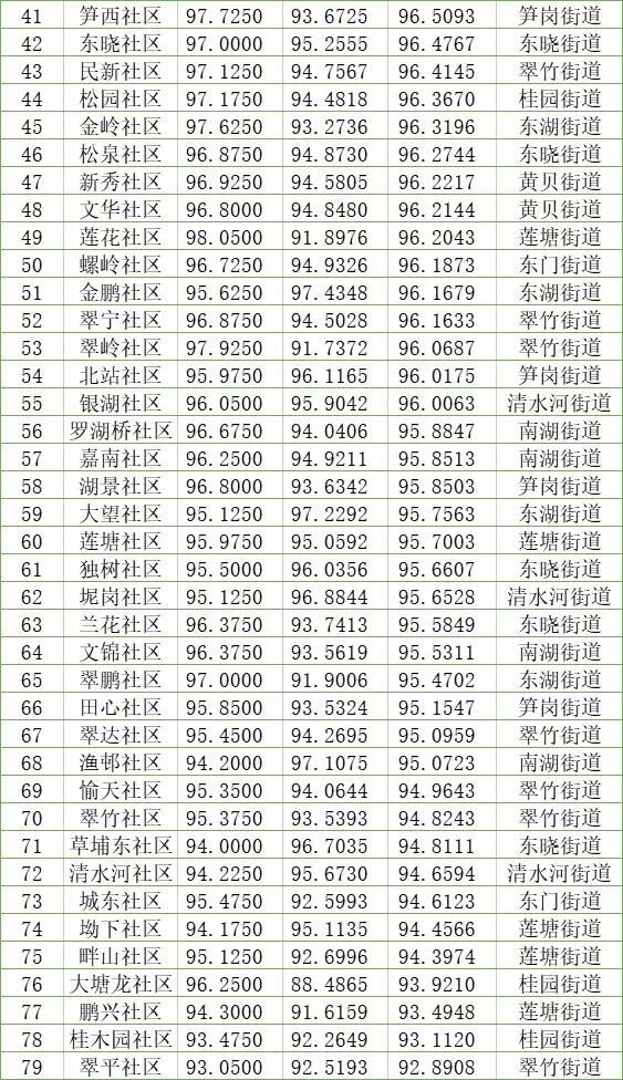 综合测评结果后三的街道依次是:莲塘街道、翠竹街道和东晓街道。其中,莲塘街道得分最低,得分为95.8322。