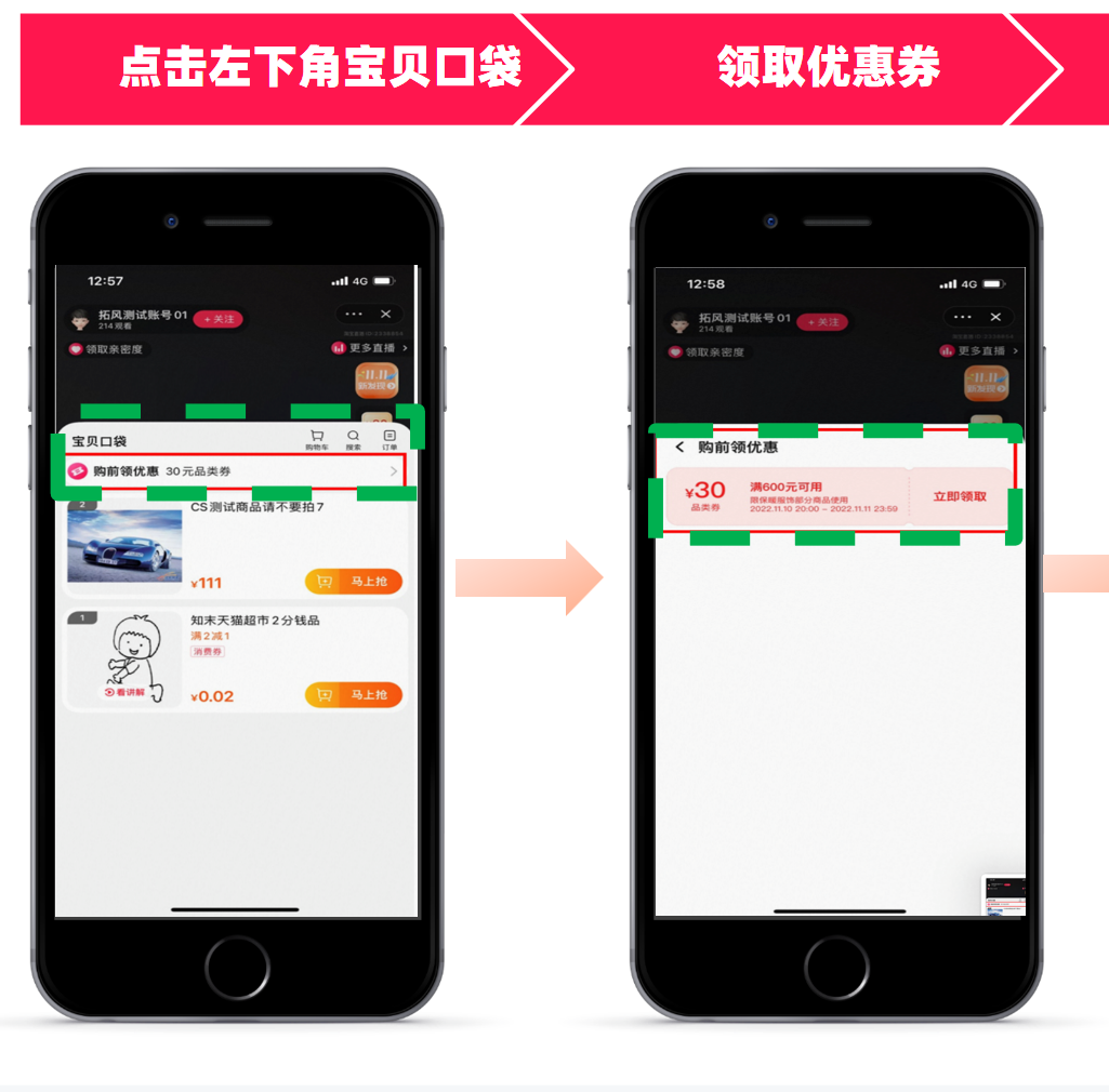 ● 直播开始前,消费者可以在店铺直播间左下角宝贝口袋领取。
