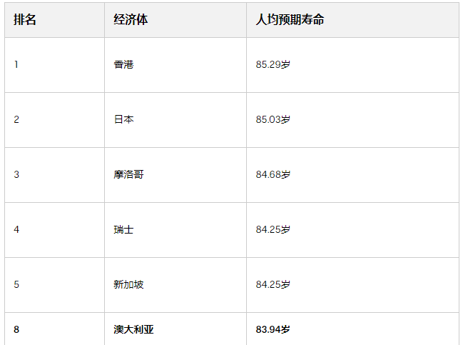 根据联合国的全球预估数据,全球男性和女性的人均寿命合计数字为72.3岁,澳大利亚人2022年人均寿命排在第八位。