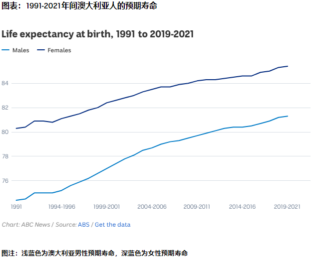 澳大利亚统计局(ABS)本月发布的数据显示,在过去的几年里,澳大利亚人的预期寿命一直在稳步上升。