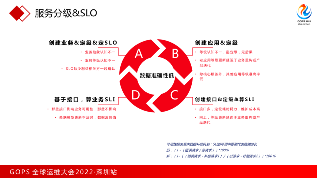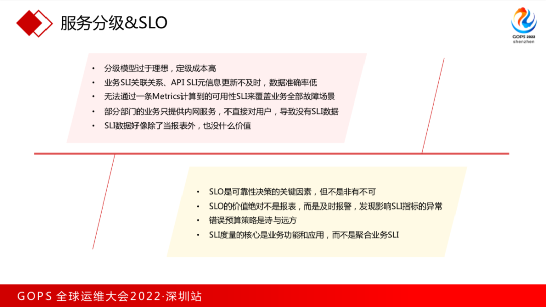 分级模型太理想,定级成本非常高; 各种元信息关联不及时,数据准确率低; 开始做 SLO 计算只算公网服务,也只算了在接入层(SLB层)指标,单条 Metrics 没办法覆盖所有业务场景; 部分内网服务不对外,导致没有 SLI 数据; SLI 数据除了当报表外,也没人看