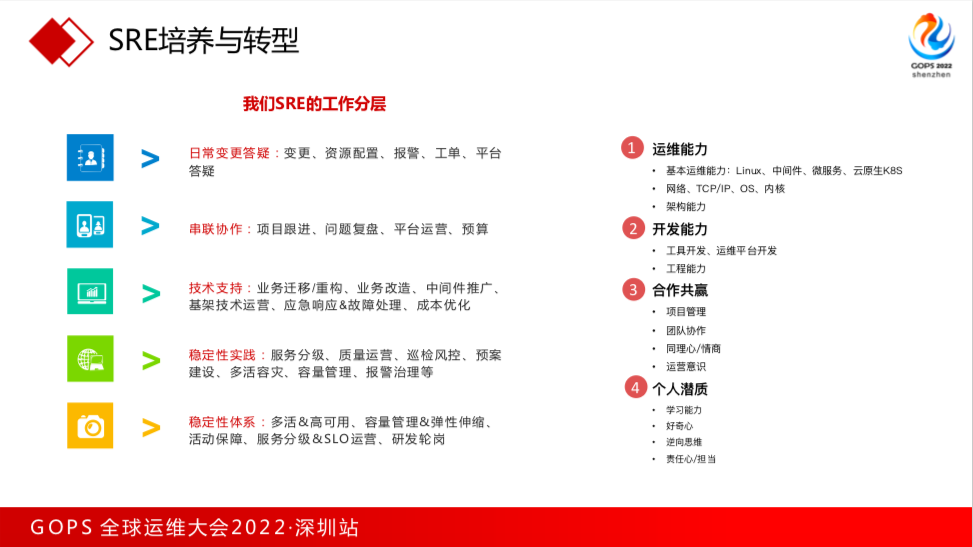 SRE文化:团队要认可SRE文化,从团队Title和组织名称可以看到对SRE的重视;从上到下传达SRE的转型;SRE职级序列;