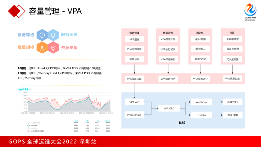 右边是K8s与VPA联动的架构图,上面是 VPA 管理平台:策略管理/数据运营/黑名单/预警。