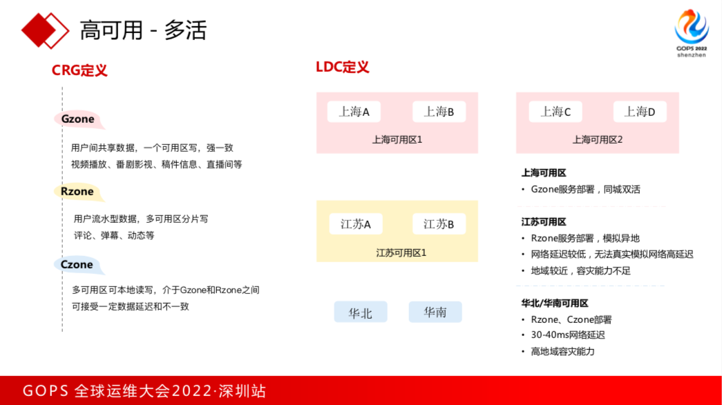 对机房进行梳理,当时上海有很多机房(都在一个地域内,机房定位比较混乱)。梳理后将上海的4个机房划成两个逻辑可用区,同城双活(Gzone 类型服务)部署在上海;把江苏可用区作为 Rzone 单元化服务部署模拟异地;我们又规划华北/华南的可用区,来做单元化、Czone 服务部署(30ms-40ms网络延迟)。
