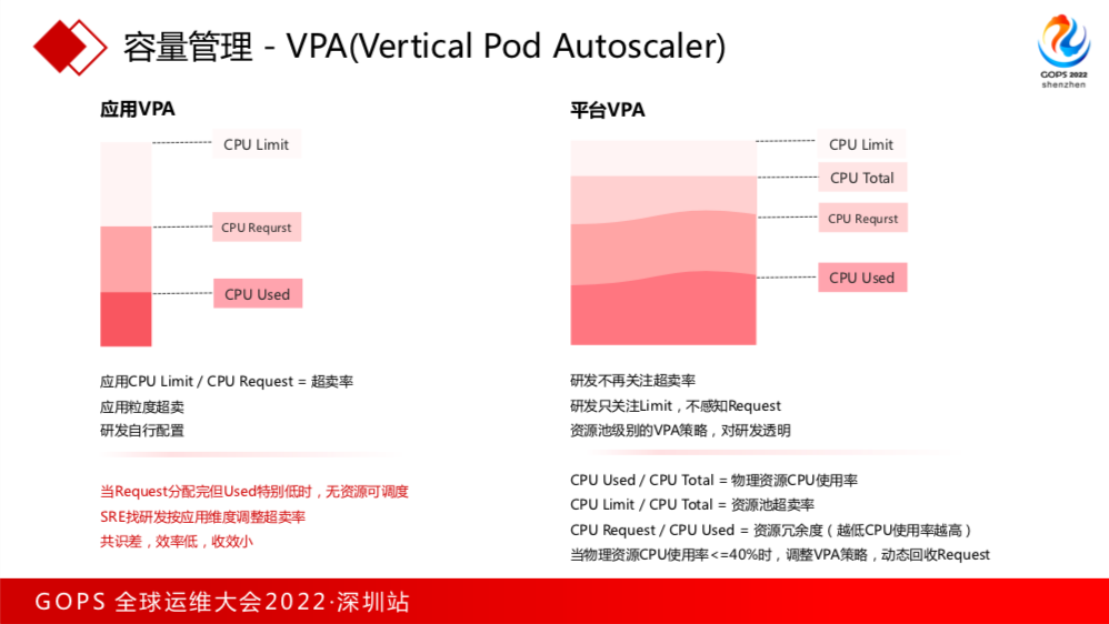 遇到一些痛点,当 Request 分配完,Used 特别低时,资源池没有资源可调度,SRE找研发按应用维度调整超卖率,对研发来讲想抢占资源,这个服务是稳定的,不想把资源释放出来,就导致共识很差,效率很低,收益特别小。后来把VPA改成平台维度。