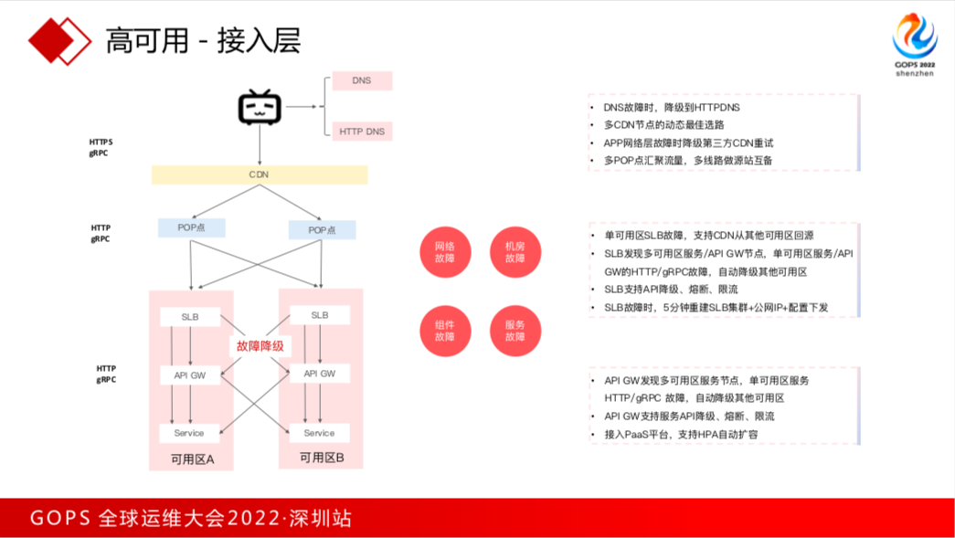 接入层的高可用方案,比如 DNS 降级 HTTP DNS、多 CDN 节点动态选路、APP边缘节点网络层故障降级第三方CDN重试;多 POP 点做流量汇聚,多线路做源站互备。