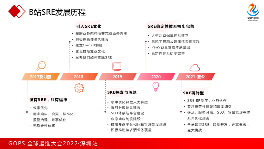 2020年 SRE 稳定性体系初步完善,20年B站做了很多活动(S10、跨晚、最美的夜等)。有了故障前的应急响应及故障后的复盘,开始探索故障前混沌工程和故障演练;质量之后是容量,B站是容器化部署(探索 PaaS 容量管理体系),在一系列落地之后,2020年稳定性体系初步完善。2021年至今SRE继续转型,从 Oncall 制度逐渐转向 BP 制度,更加关注稳定性和降本增效。之前做了多活、服务分级、SLO都会在今年重新做优化建设。全员现在在做 SRE 转型。