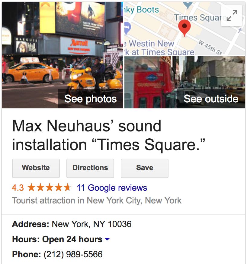 由Max Neuhaus安装的声音装置,被设置在人来人往的时代广场中间。它在1970年代创建,现在已经成为纽约的永久建造艺术。