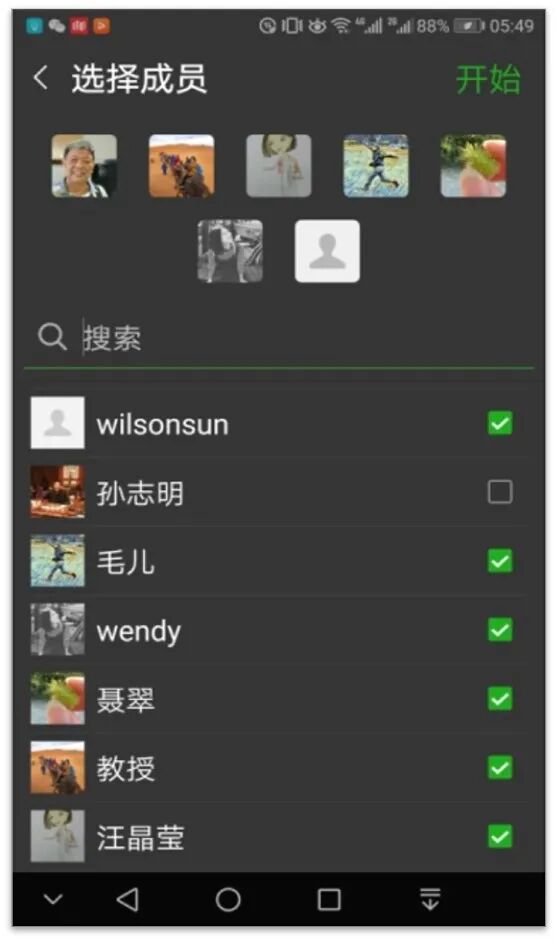 注意到发起语音通话的人:九如,后面的方框,已被点击勾选。勾选的对象,或是自己微信的朋友,也可以不是和自己有微信关系的朋友。可以挑选单个成员(图9),也可以挑选多个成员(图10)。