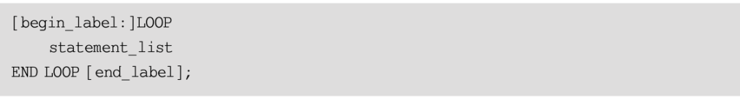 LOOP语句用来实现简单的循环,使系统能够重复执行循环体内的语句列表。与IF和CASE语句相比,LOOP只是实现了一个简单的循环,并不进行条件判断。LOOP语句的基本语法格式如下所示。
